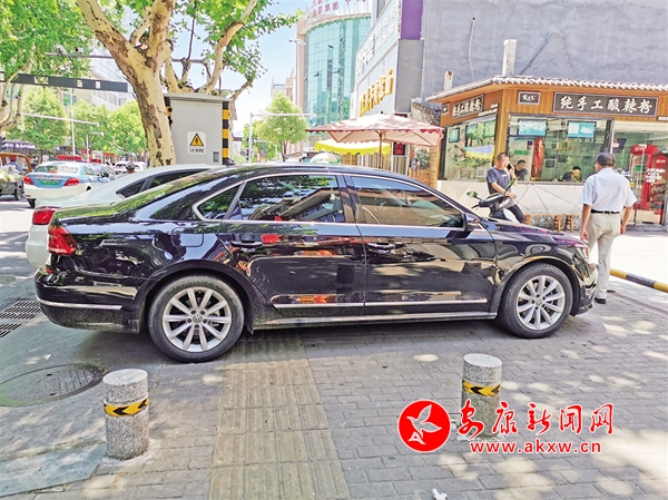 6月30日,在漢濱區(qū)鼓樓街興安中路十字,汽車(chē)、摩托車(chē)占用人行道,給行人帶來(lái)不便。(記者 潘潤(rùn)生 攝)