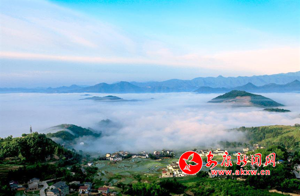在茫茫山野間,在縹緲云霧間,上萬株桃花好似一夜怒放,大片大片粉白染遍了山頭,宛如一場朦朧的夢。