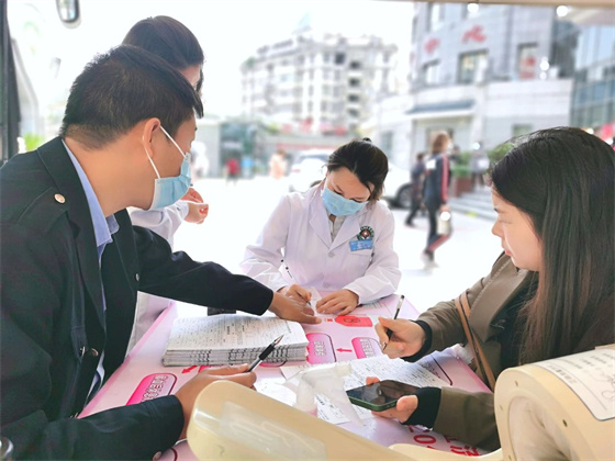 早上9點(diǎn),列隊(duì)等候的醫(yī)務(wù)工作者們?cè)讷I(xiàn)血車(chē)前,井然有序的進(jìn)行信息登記、健康征詢(xún)、血壓測(cè)量等程序。他們中有多次獻(xiàn)血的“老兵”,也有首次獻(xiàn)血的年輕職工,有的剛下夜班,有的趁工作間隙,還有的則放棄了休息趕來(lái)。大家紛紛表示,無(wú)償獻(xiàn)血就是以實(shí)際行動(dòng)踐行廣大醫(yī)護(hù)人員的初心使命,為老百姓的生命健康保駕護(hù)航。