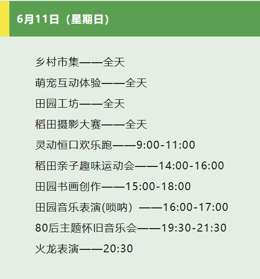 當(dāng)日,現(xiàn)場(chǎng)還舉辦了稻田拔河、稻田摸魚(yú)、稻田摔跤等娛樂(lè)活動(dòng)和田園古箏表演、70后主題懷舊音樂(lè)會(huì)、火龍表演等演出活動(dòng),吸引眾多游客朋友前來(lái)打卡。6月11日,靈動(dòng)恒口歡樂(lè)跑、親子趣味運(yùn)動(dòng)會(huì)、嗩吶音樂(lè)表演、80后主題懷音樂(lè)會(huì)等活動(dòng)精彩繼續(xù)......?