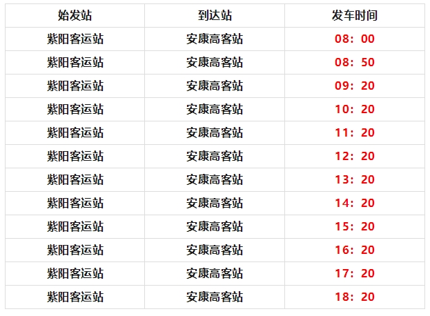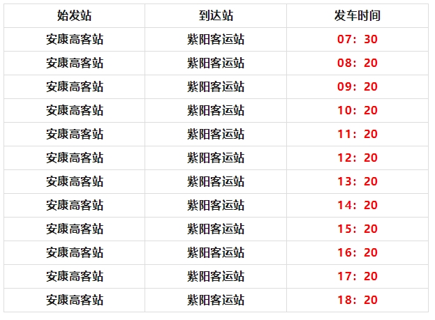 紫陽(yáng)客運(yùn)站發(fā)往安康高速客運(yùn)站,每日12班,發(fā)車時(shí)間為: