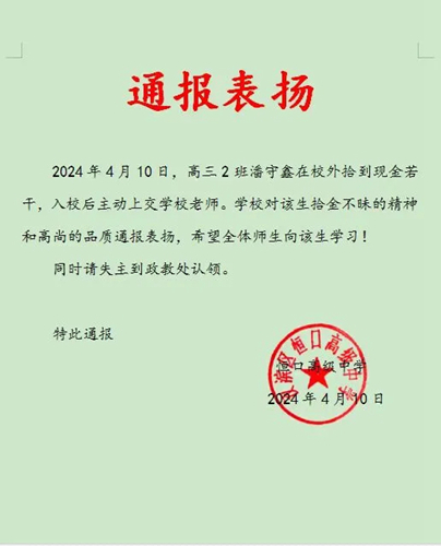 該校對潘守鑫同學(xué)拾金不昧的善舉進(jìn)行了表揚(yáng),并號召全校師生學(xué)習(xí)這種拾金不昧的精神,充分發(fā)揚(yáng)中華民族的傳統(tǒng)美德。