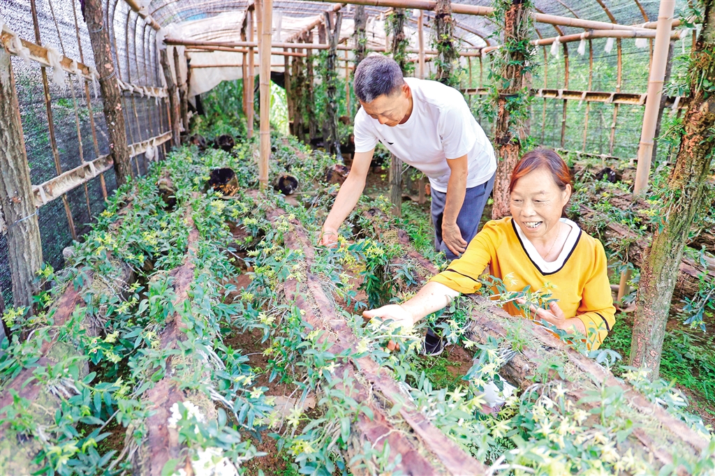 大道河鎮(zhèn)月池臺(tái)村四組胡德銀與妻子查看鐵皮石斛的生長(zhǎng)情況。張?zhí)毂?攝