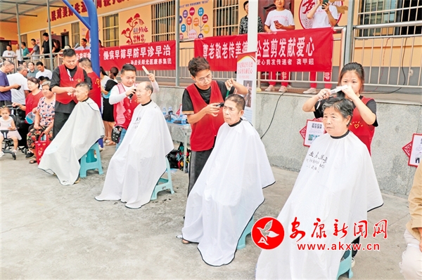 現(xiàn)場(chǎng),通過(guò)有獎(jiǎng)問(wèn)答、發(fā)放宣傳資料、設(shè)立咨詢臺(tái)等形式,向村民進(jìn)行平安建設(shè)、普法、反詐等宣傳。來(lái)自漢濱區(qū)陽(yáng)光愛心護(hù)理院的志愿者們?yōu)槔先藗兲峁┙】抵笇?dǎo)。愛心人士龔甲超組織的義剪活動(dòng)也受到了老人們的歡迎,志愿者們免費(fèi)為現(xiàn)場(chǎng)50多名老人理發(fā)。書法家們現(xiàn)場(chǎng)圍繞“孝義”主題進(jìn)行創(chuàng)作,并贈(zèng)送給群眾。演出結(jié)束后,近百名老人到社區(qū)的孝義食堂參觀和免費(fèi)用餐。