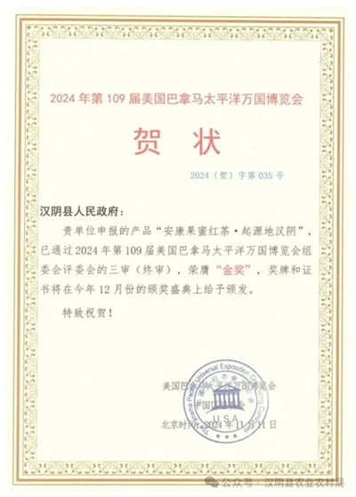 “安康果蜜紅·起源地漢陰”榮獲美國(guó)巴拿馬萬國(guó)博覽會(huì)金獎(jiǎng)