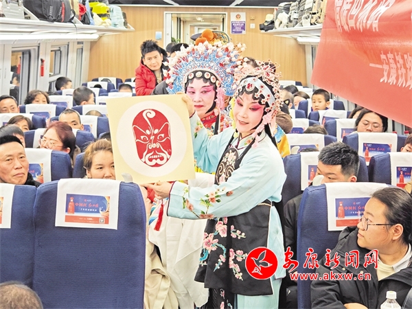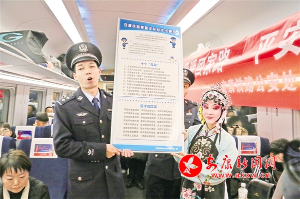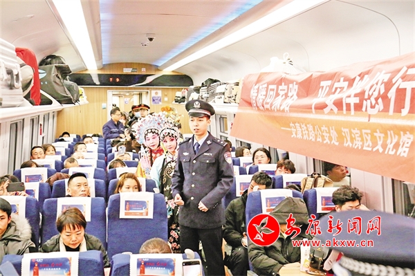 火車穿越秦巴山水間,途中,來自安康漢調(diào)二黃研究院的專業(yè)演員和地方民間漢調(diào)二黃愛好者們一同表演了國家級非物質文化遺產(chǎn)——漢調(diào)二黃經(jīng)典戲曲演唱,并為旅客們講解漢調(diào)二黃戲曲知識,與旅客們開展互動交流,讓旅客親身體驗漢調(diào)二黃戲服道具,感受漢調(diào)二黃的獨特藝術魅力。來自漢濱區(qū)文化館的漢濱剪紙技藝傳承人為旅客們展示講解了安康市級非物質文化遺產(chǎn)——漢濱剪紙技藝,向參與互動的旅客送上了親手創(chuàng)作的漢濱剪紙作品,提前送上新春祝福。活動中,西安鐵路公安局安康公安處的民警們和文藝工作者們一同宣傳普及了反詐知識,進一步提升旅客的安全防范意識。