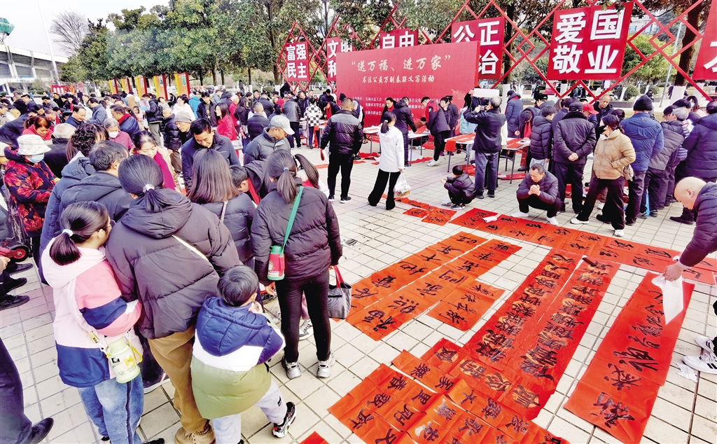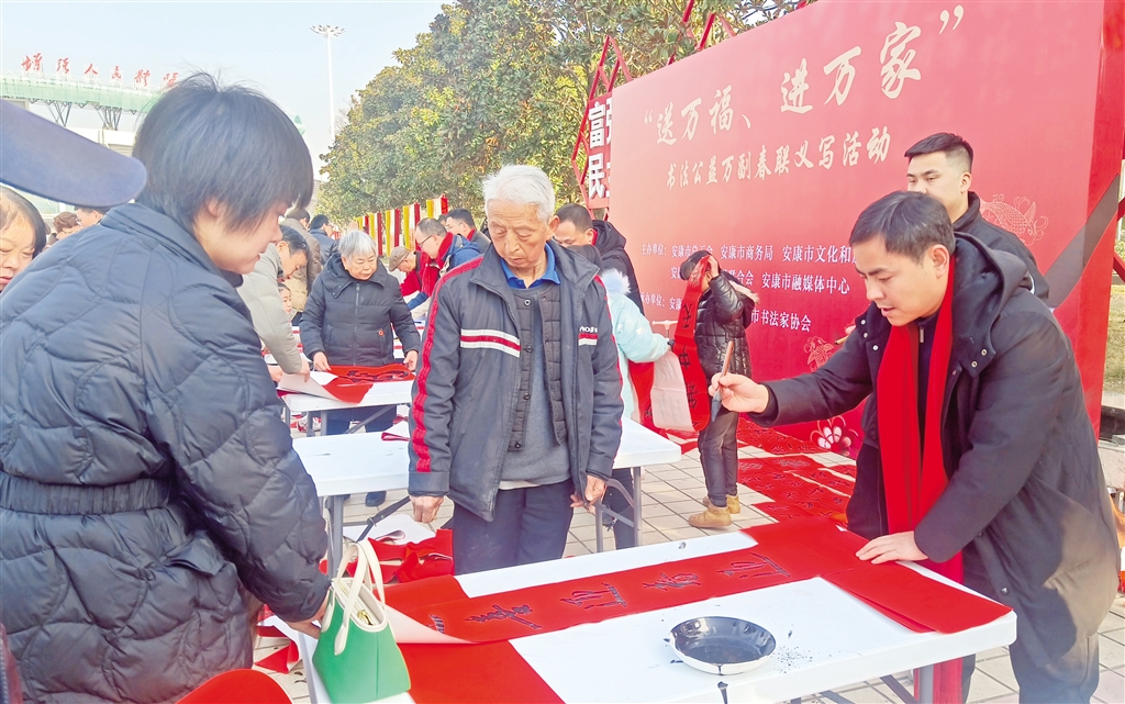 活動(dòng)現(xiàn)場(chǎng),人頭攢動(dòng),長(zhǎng)桌一字?jǐn)[開(kāi),書(shū)法家們精神飽滿,手中的毛筆飽蘸濃墨,筆鋒游走間,楷、行、隸、草等多種書(shū)體各顯神韻,一副副滿載祝福的春聯(lián)、一張張承載希望的“?!弊周S然紙上,飽含著濃濃年味兒,寄托著人們對(duì)新年的美好憧憬與希望。前來(lái)領(lǐng)取春聯(lián)的市民絡(luò)繹不絕,大家一邊欣賞書(shū)法創(chuàng)作,一邊挑選著心儀的春聯(lián)內(nèi)容,現(xiàn)場(chǎng)氣氛熱烈融洽?;顒?dòng)還將在安康高新區(qū)、西城坊、部分旅游景點(diǎn)等地持續(xù)進(jìn)行。(記者 陸青波 攝)