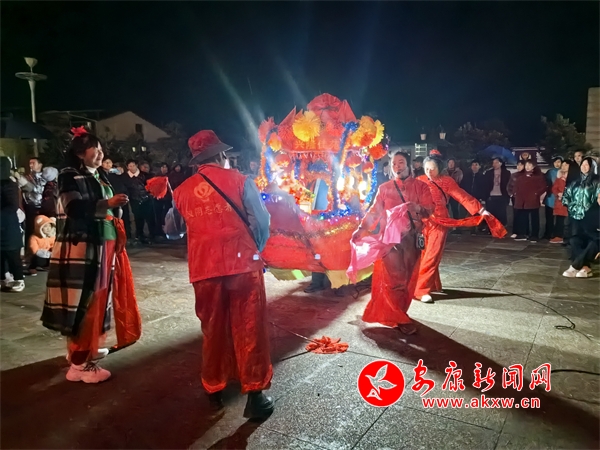 在位于漢陰縣平梁鎮(zhèn)的興隆佳苑社區(qū),春節(jié)期間,小區(qū)里處處洋溢著節(jié)日氛圍。夜幕降臨,社區(qū)廣場響起陣陣鑼鼓聲,?;ù硌菡介_始。只見表演者雙手提船、配合默契,船體隨著“波浪”旋轉(zhuǎn)、顛簸,身穿喜慶艷麗的服裝、頭戴五彩頭飾的表演人員個個精神抖擻,一邊前行,一邊唱著漢陰本地的花鼓戲,祈求來年風(fēng)調(diào)雨順、福壽安康。翻飛的彩扇、華麗的彩船,精心編排、詼諧幽默的表演,為社區(qū)群眾呈現(xiàn)了一場精彩的視覺盛宴。