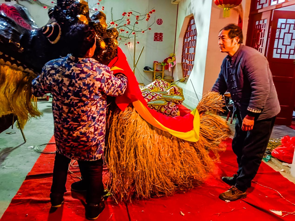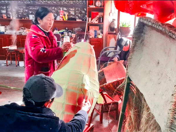 “龍頭是整條龍的重點,刻畫要逼真,色彩還得鮮艷。忙碌了一年的鄉(xiāng)親們,就希望在正月里,抖擻精神,舞動起來。”說話間,李忠寶一雙巧手上下翻飛,正在修剪龍頭花燈的胡須,忙得額頭沁出了汗珠。兒子李石磊則忙著幫烤、粘、填、糊、上色……在他們父子倆的精雕細琢下,一個威風(fēng)凜凜、栩栩如生的花燈道具龍頭,總算扎制完成。