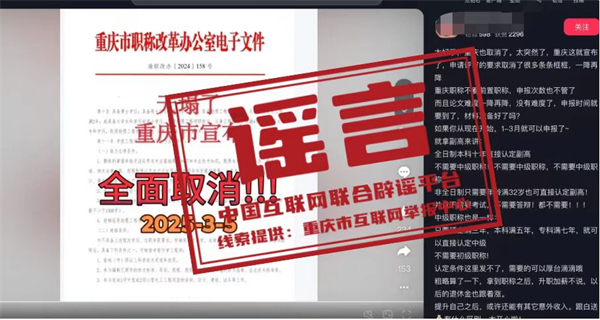 真相:近日,有網(wǎng)民在互聯(lián)網(wǎng)平臺發(fā)布消息稱“重慶市宣布,申請評審的要求取消了很多條條框框,職稱申請不看前置職稱,全日制本科十年直接認定副高,不需要中級職稱”,引發(fā)關(guān)注。經(jīng)核實,網(wǎng)傳信息系謠言。職稱評審均需逐級晉升,取得上一級職稱并滿足相應(yīng)學(xué)歷資歷條件后方可晉升高一級職稱。目前重慶市除特殊人才、博士后等3個針對特定對象的職稱申報綠色通道外,正常申報通道均需逐級晉升。網(wǎng)傳文件是網(wǎng)民通過P圖軟件編輯而成,試圖吸引不明真相的群眾咨詢,借機推銷職稱代辦服務(wù),收取高額費用。目前,謠言線索已轉(zhuǎn)交公安機關(guān)進一步調(diào)查處置。(來源:“重慶辟謠”微信公眾號)
