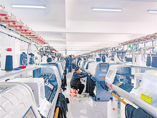 工人正在吉?jiǎng)?chuàng)暉羊毛衫工廠調(diào)試機(jī)器