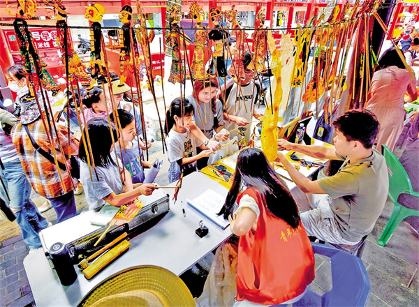 “五一”假期,安康非遺文化展示活動(dòng)在漢濱區(qū)老城街道民俗夜市長(zhǎng)廊舉辦,安康皮影吸引游人駐足欣賞。吳定國(guó) 攝?