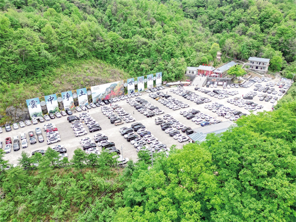 “五一”假期,嵐皋縣南宮山景區(qū)持續(xù)火爆。圖為“滿(mǎn)員”的北線停車(chē)場(chǎng)。 陳陽(yáng) 攝