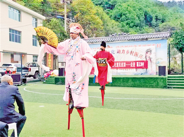 在五峰村,村支部書記羅仁春告訴記者,2023年村委會牽頭成立了五峰村文化民俗文藝協(xié)會,陸續(xù)加入的48名會員涵蓋老中青三代,既有傳承高蹺絕技的老人,也有主動學(xué)習(xí)弦子腔的年青一代。今年32歲的村民小梅加入?yún)f(xié)會后,一改往日下班后悶在家中的狀態(tài),每天下午吃完飯都會下樓和新認(rèn)識的姐妹載歌載舞,很快就成為舞蹈隊(duì)的主力?!耙郧安恢牢覀兇迳线€有文藝協(xié)會,自從村上干部告訴我后,我就趕緊加入了這個小團(tuán)體,既鍛煉了身體,又愉悅了心情,生活幸福感越來越強(qiáng)烈?!鄙碇璧阜男∶飞碜随鼓龋滹w揚(yáng)間,明媚的笑容如花一樣燦爛。