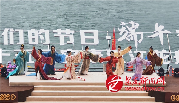 活動現(xiàn)場,6聲渾厚鐘聲劃破長空?!熬拺严荣t……”隨著主祭官畫外音傳來,60名身著青綠漢服的女子手捧香粽菖蒲,踏古琴清音翩躚而出。屈原塑像被緩緩護送入舞臺中央,112名身著漢服的學童齊聲詠頌祭文的聲浪在江岸回蕩。隨著粽拋碧波,香囊、梔子花贈客,流淌千年的龍舟文化,化作平安順利、幸福安康的當代回響。