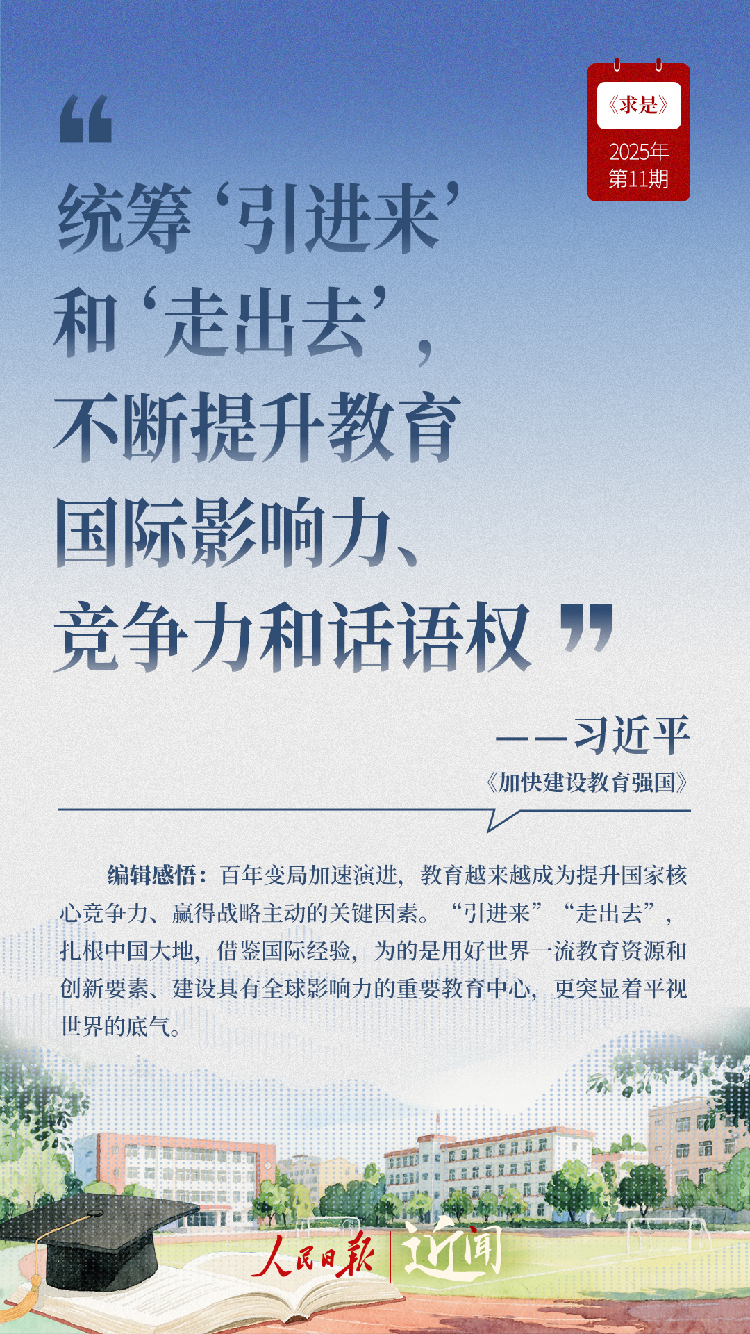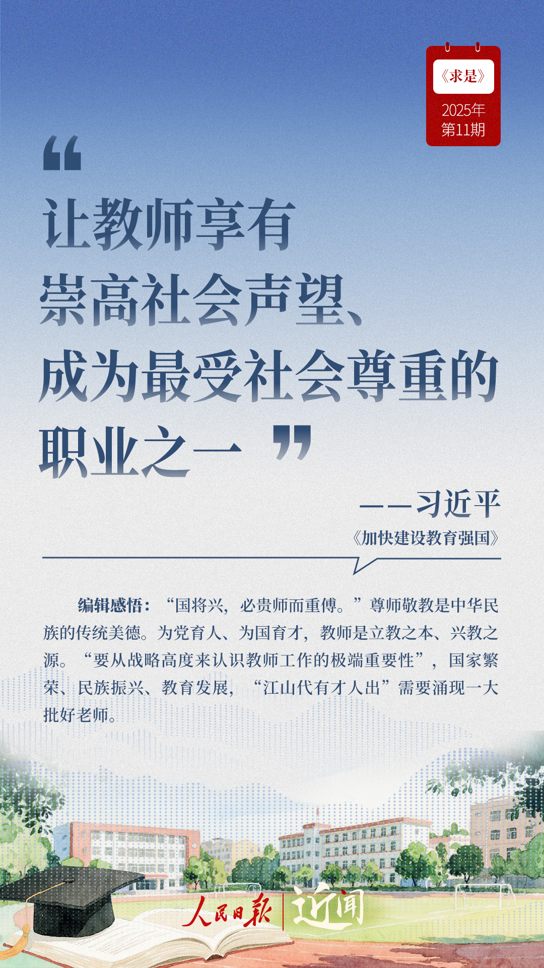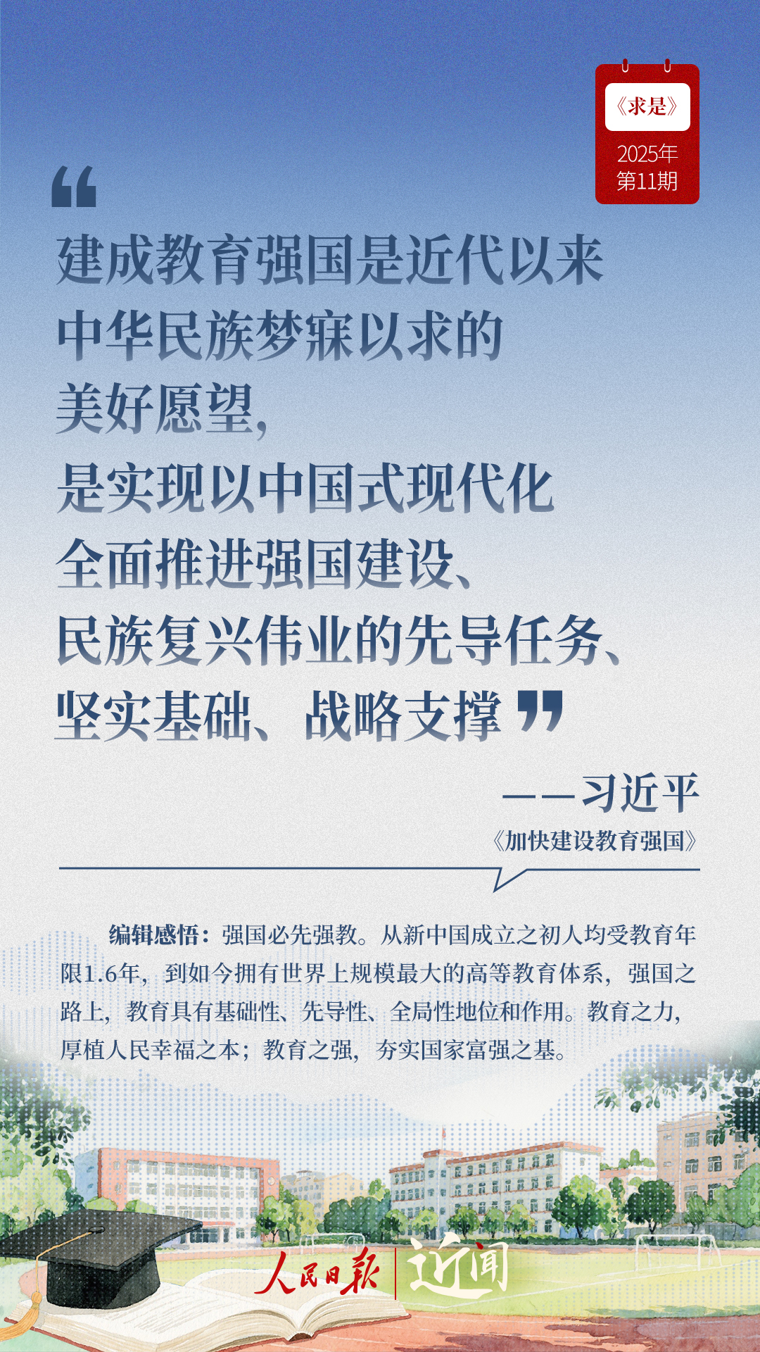 ?教育是國之大計、黨之大計。日前,《求是》雜志發(fā)表習(xí)近平總書記重要文章《加快建設(shè)教育強(qiáng)國》?!叭姘盐战逃恼螌傩?、人民屬性、戰(zhàn)略屬性”“讓教育改革發(fā)展成果更多更公平惠及全體人民”“讓教師享有崇高社會聲望、成為最受社會尊重的職業(yè)之一”……通過這些話,一起感悟習(xí)近平總書記對教育強(qiáng)國建設(shè)的謀劃與部署。