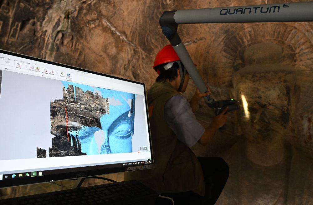 2025年4月9日,武漢大學(xué)文化遺產(chǎn)智能計算實驗室團(tuán)隊成員在魏字洞使用關(guān)節(jié)臂掃描儀對佛像進(jìn)行數(shù)字化掃描。圖片來源新華社