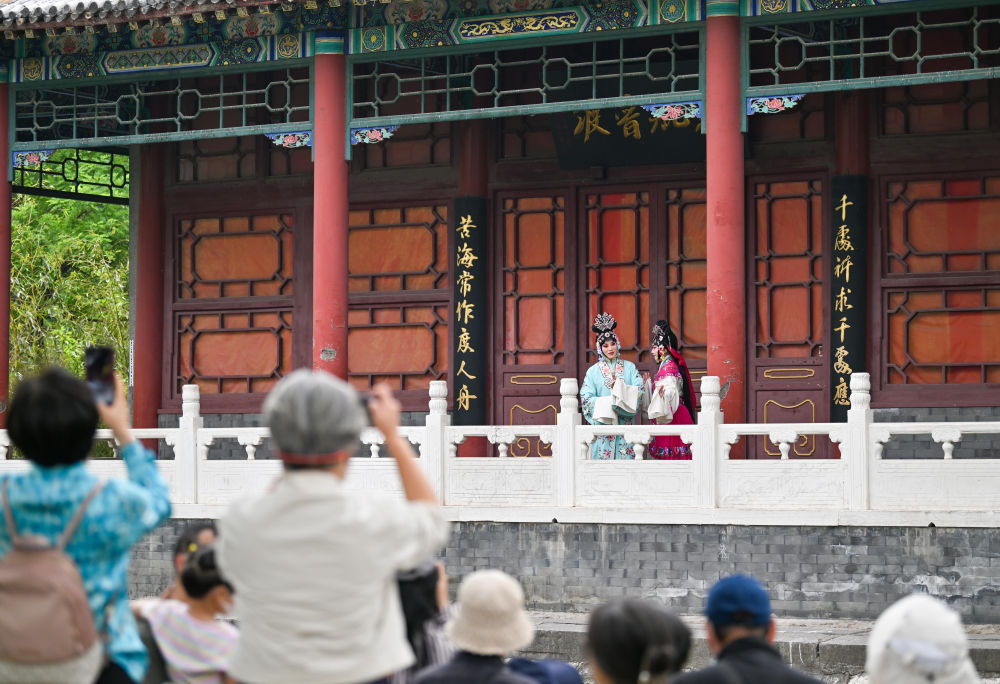 2025年5月5日,觀眾在天津人民公園欣賞戲曲《西廂記》演出。