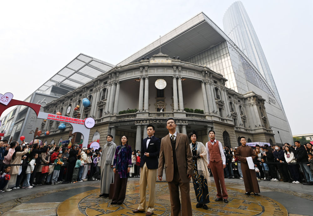 2024年10月26日,演員在天津金街室外表演話劇《日出》片段。