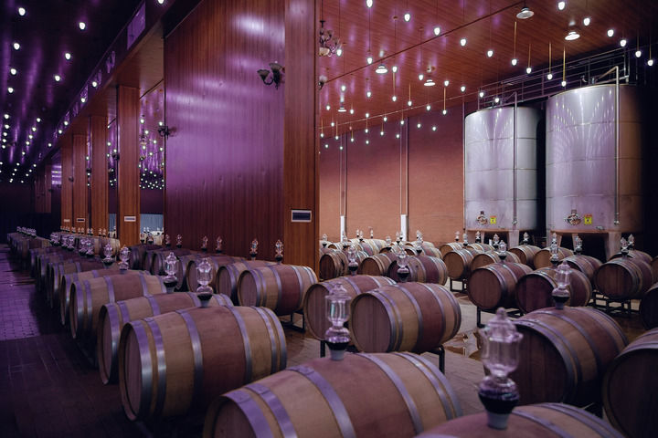 閩寧鎮(zhèn)賀蘭神酒莊釀酒車(chē)間的橡木桶。(永寧縣委宣傳部供圖)