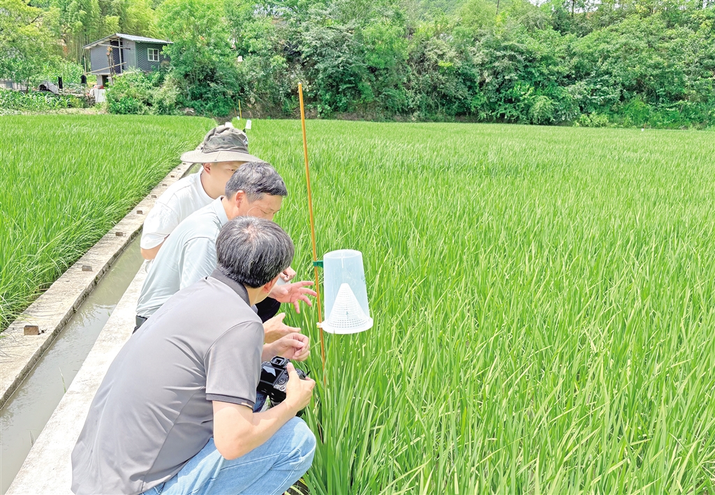日頭漸漸升高,稻田里的露水被曬成水汽,連片的稻禾舒展著葉片,陽光下泛著健康的碧綠色。黃林權(quán)沿著田壟往前走,每經(jīng)過一個誘捕器就停下來,或調(diào)整角度,或記錄數(shù)量,鞋上的泥點(diǎn)濺到褲腿上也渾然不覺。