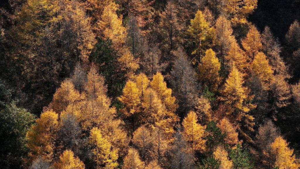 位于六盤(pán)山西麓的寧夏固原市西吉縣大寨山林場(chǎng)秋景(無(wú)人機(jī)照片)。新華社記者 楊植森 攝