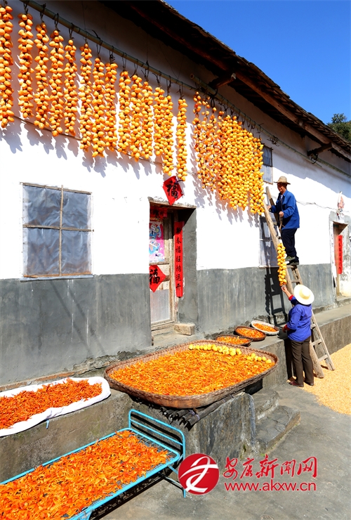 鄉(xiāng)親們趁著柿子還沒軟就采摘下來,在房前屋后搭起一排排晾曬柿餅的木架,開始每年一次的傳統(tǒng)手工勞作:去皮、懸掛、晾曬。出霜后就成了美味的柿餅。