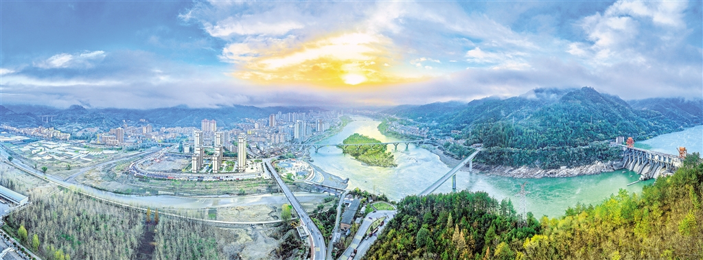 11月19日,石泉縣城晨光初照,金輝灑落漢江,霧從群山間奔涌而出,冬景美不勝收。董長松 攝