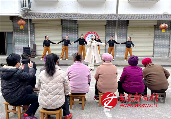 首場活動在城關(guān)鎮(zhèn)湯坪社區(qū)拉開帷幕。上午9點,演出團隊的小巴剛開進社區(qū)院子,志愿者們就迅速布置起臨時舞臺。隨著音樂聲響起,原本安靜的院子漸漸熱鬧起來,居民們?nèi)齼蓛蓢鷶n過來。暖陽下,志愿者早就擺好整齊的凳子,等候老人們?nèi)胱?/p>