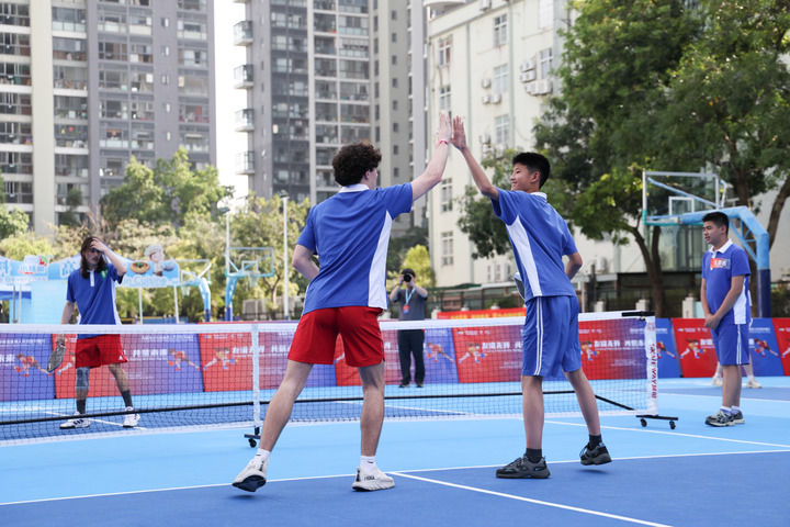 4月15日,在深圳市南山外國語學(xué)校(集團(tuán))高新中學(xué),中美學(xué)生結(jié)對(duì)進(jìn)行匹克球雙打比賽。新華社記者 梁旭 攝
