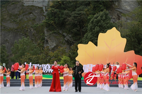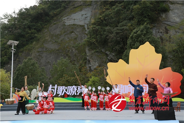 金秋時節(jié)的茨溝鎮(zhèn),萬畝紅葉、層林盡染。伴隨著歡快的鑼鼓聲,茨溝鎮(zhèn)、五里鎮(zhèn)、譚壩鎮(zhèn)三支隊(duì)伍輪番登場,不僅獻(xiàn)唱原創(chuàng)村歌,還展示特色產(chǎn)業(yè)、優(yōu)質(zhì)資源與地方文化,紛紛亮出獨(dú)具特色的“看家絕活兒”。歌伴舞《村歌飛揚(yáng)》《松壩謠》《幸福歌兒唱起來》唱出了鄉(xiāng)親們的幸福生活;以修建八一水庫為背景的安康歌謠《我來了》引發(fā)會場共鳴;民俗表演《龍的傳人》則將節(jié)目推向高潮。舞蹈、鄉(xiāng)村T臺秀、民俗表演、八岔戲等節(jié)目,或以傳統(tǒng)幽默詼諧的風(fēng)格,或以深情敘述的方式,展現(xiàn)鄉(xiāng)村新生活,為觀眾獻(xiàn)上一場別開生面的視聽盛宴,現(xiàn)場歡呼聲此起彼伏。