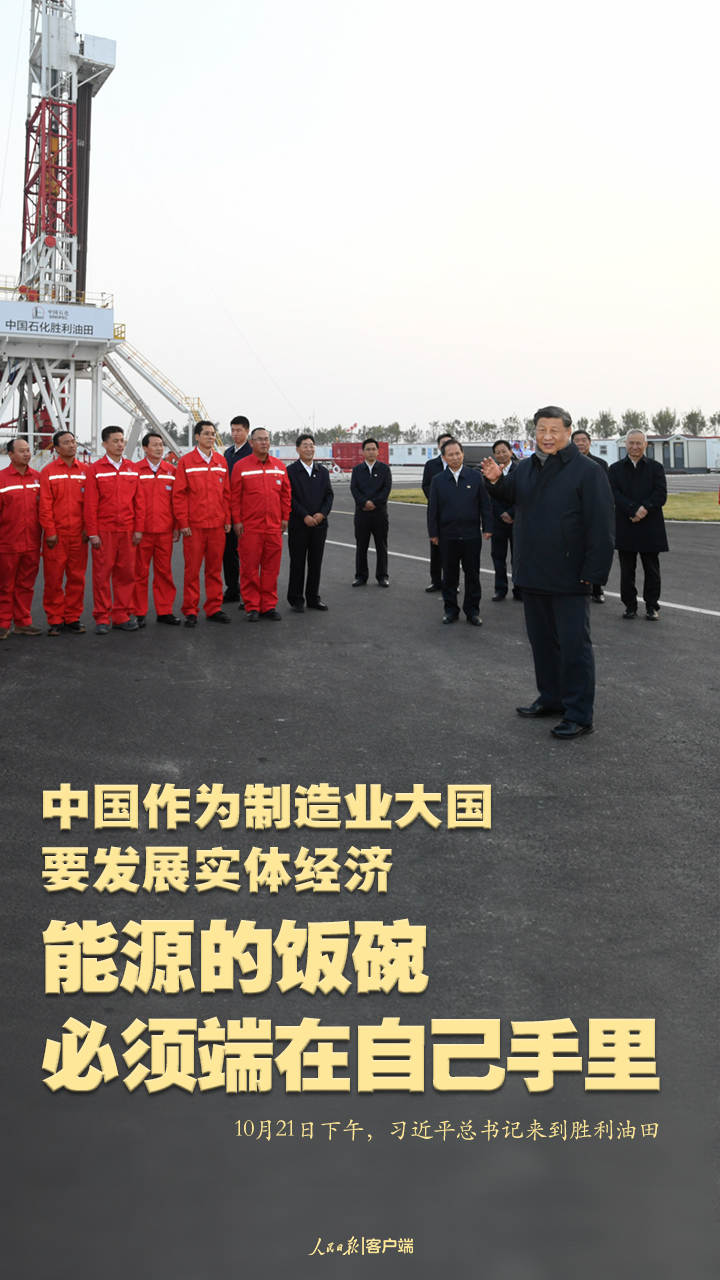 21日下午,習(xí)近平總書記來到勝利油田,登上鉆井平臺,察看作業(yè)情況,看望慰問石油工人。今年是勝利油田發(fā)現(xiàn)60周年。習(xí)近平代表黨中央向廣大石油職工致以誠摯問候。習(xí)近平指出,石油能源建設(shè)對我們國家意義重大,中國作為制造業(yè)大國,要發(fā)展實體經(jīng)濟(jì),能源的飯碗必須端在自己手里。希望你們再創(chuàng)佳績、再立新功。