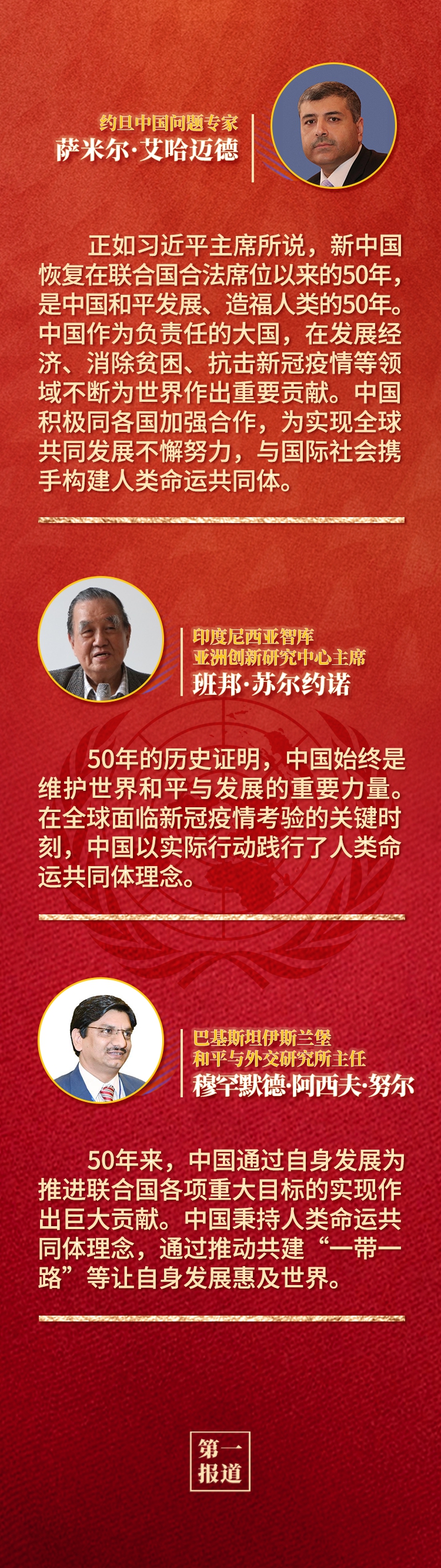 多國(guó)人士認(rèn)為,中華人民共和國(guó)恢復(fù)聯(lián)合國(guó)合法席位是世界和聯(lián)合國(guó)歷史上的一個(gè)大事件,習(xí)近平主席的重要講話(huà)回顧了中國(guó)和平發(fā)展、造福人類(lèi)的50年,為實(shí)現(xiàn)世界永續(xù)和平發(fā)展提出重要倡議,為全球共同推動(dòng)構(gòu)建人類(lèi)命運(yùn)共同體注入新的強(qiáng)大動(dòng)力。
