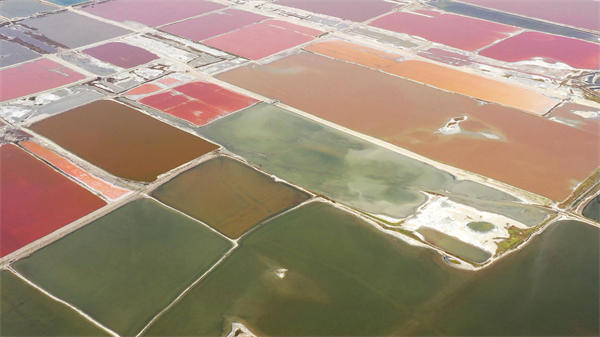 △運城鹽湖。夏季是鹽湖里微生物繁衍的旺盛期,不同的微生物使得鹽湖的不同池水呈現(xiàn)出不同的色彩,造就了七彩鹽湖的奇觀。(總臺記者裴大偉拍攝)