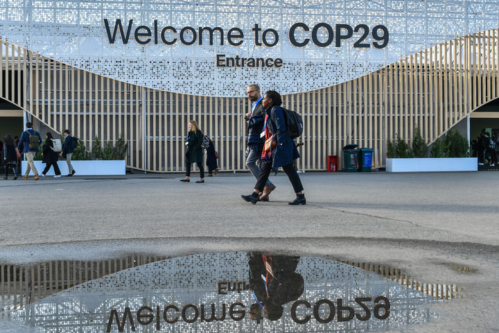 2024年11月15日,在阿塞拜疆首都巴庫(kù),人們經(jīng)過(guò)聯(lián)合國(guó)氣候變化巴庫(kù)大會(huì)的會(huì)場(chǎng)。新華社記者 曹陽(yáng) 攝