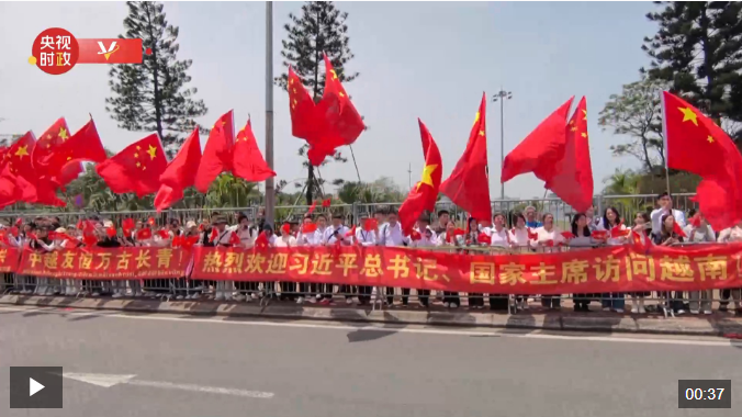 習(xí)近平乘車從機(jī)場赴下榻飯店途中,中越兩黨兩國旗幟迎風(fēng)飄揚(yáng),“中越友誼萬古長青”、“山水相連,命運(yùn)與共”、“中越情誼深,同志加兄弟”等紅色橫幅鮮艷奪目。當(dāng)?shù)孛癖姾椭匈Y機(jī)構(gòu)、留學(xué)生代表聚集在道路兩旁,熱烈歡迎習(xí)近平到訪。