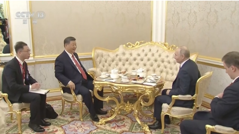 當?shù)貢r間5月8日下午,俄羅斯總統(tǒng)普京同中國國家主席習(xí)近平在克里姆林宮總統(tǒng)辦公室進行茶敘。
