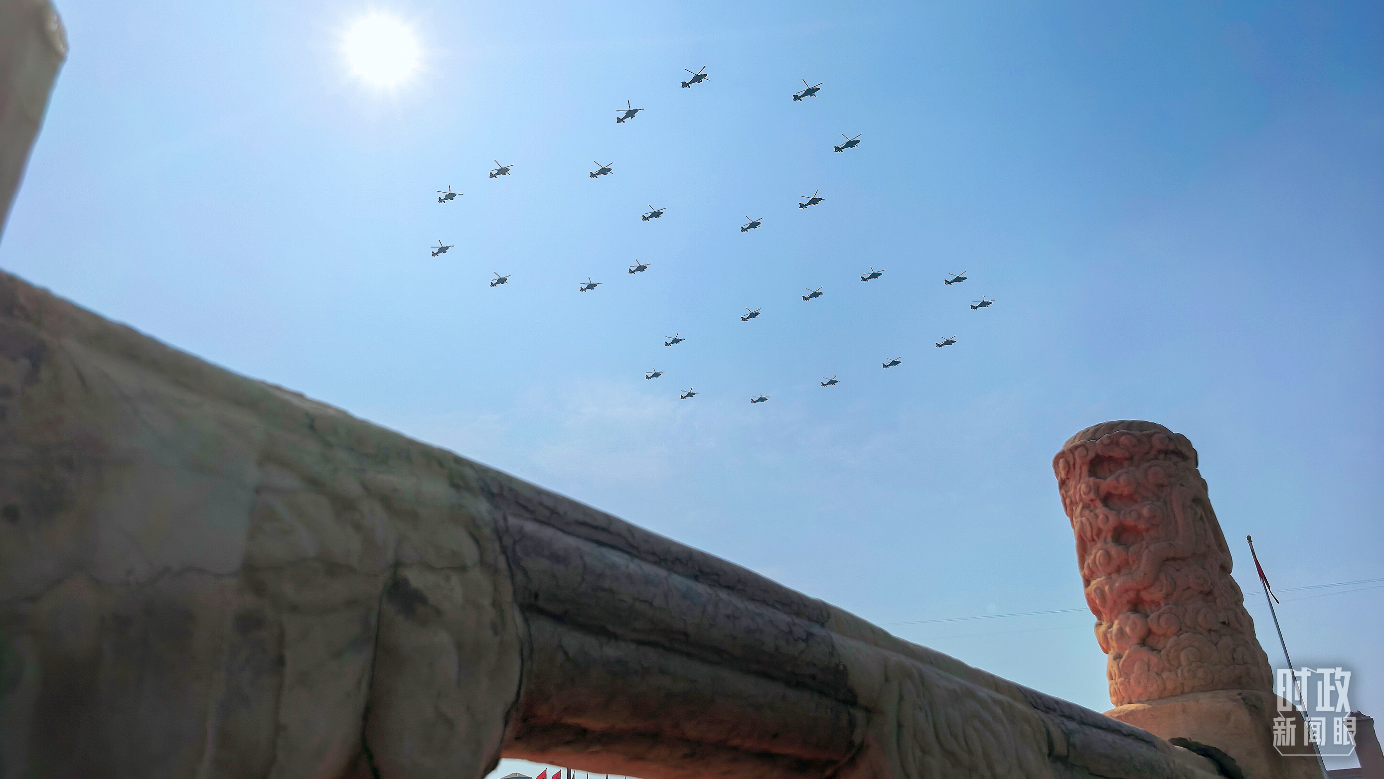 空中護旗梯隊率先亮相分列式環(huán)節(jié),26架直升機組成巨大的“80”字樣。教練機梯隊拉出14道彩煙,向中華民族14年可歌可泣的抗戰(zhàn)歷程致敬,向14億多中國人民奔向強國復興的不懈奮斗致敬。