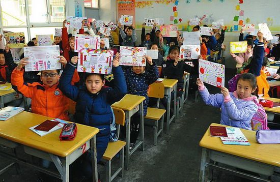 西安一小學(xué)的學(xué)生展示自己創(chuàng)作的海報(bào)作品。陜西日?qǐng)?bào)記者 杜瑋攝