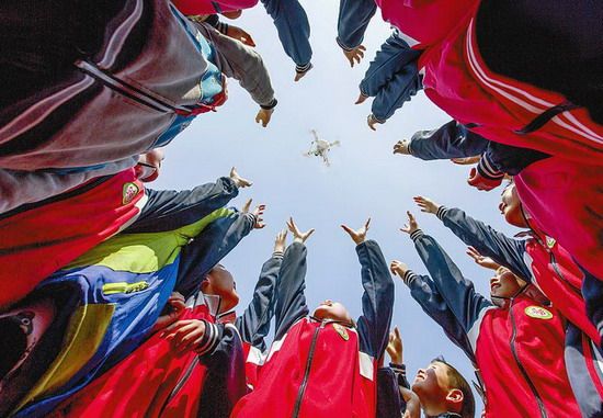 騰空而起的無(wú)人機(jī)讓孩子們頓時(shí)歡呼雀躍起來(lái)。通訊員 賀粵軍攝