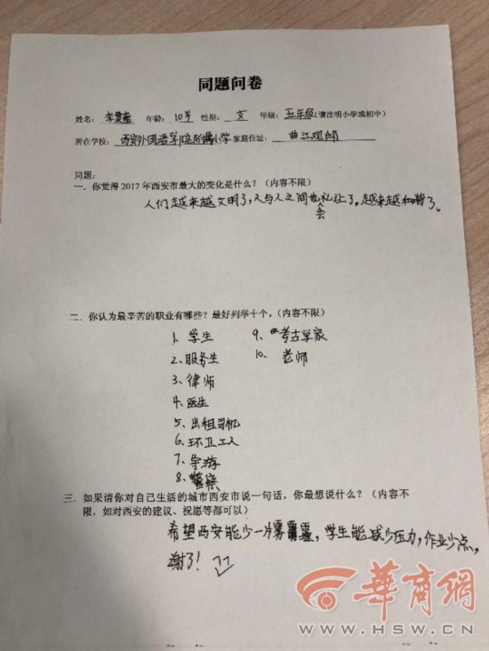 10歲的李曼嘉在西安外國(guó)語(yǔ)大學(xué)附屬小學(xué)上學(xué),她寫(xiě)下學(xué)生,“我要上六年級(jí)了,學(xué)習(xí)壓力很大,每天作業(yè)很多,而且要備戰(zhàn)古箏十級(jí)!崩盥握f(shuō)。