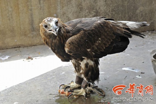 4月1日下午,在西安市興慶宮公園的鳥(niǎo)語(yǔ)林內(nèi),被西安森林公安局查扣的疑似金雕正在大口地叼著肉吃,小家伙狀態(tài)良好。這只猛禽就是華商報(bào)3月31日A03版報(bào)道的酒店大堂飼養(yǎng)的疑似國(guó)家一級(jí)保護(hù)動(dòng)物金雕。