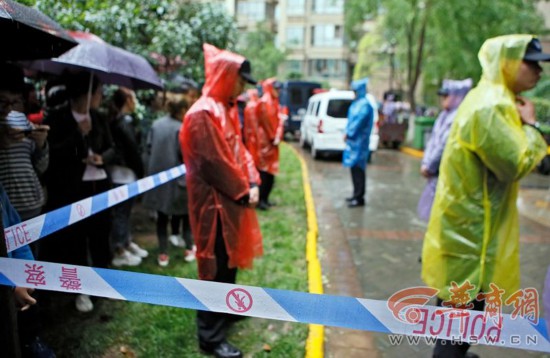 昨日,得知指認(rèn)現(xiàn)場的消息后,近百名業(yè)主冒著大雨前往事發(fā)單元樓下圍觀。當(dāng)嫌疑人令某杰被從警車上押解下來時(shí),業(yè)主們?cè)僖部刂撇蛔∽约旱那榫w,大聲呼喊著,“畜生!嚴(yán)懲兇手!”