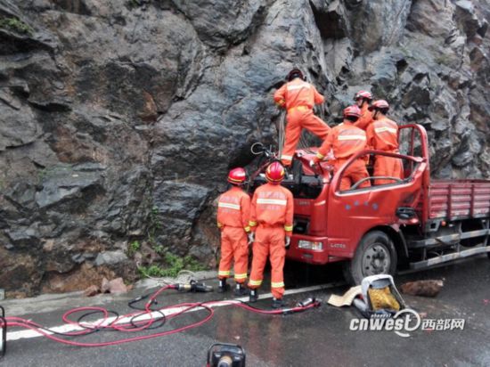 310國(guó)道落石砸中過(guò)往車輛一人被困,消防緊急救援。