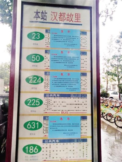 王女士說(shuō),她家住在漢城北路漢都故里小區(qū),門前有6條公交線,她在土門上班,每天乘坐23路和631路就可直達(dá)單位附近,十分方便?墒,8月20日下班回到小區(qū)門口的公交車站時(shí),發(fā)現(xiàn)有224路、50路、23路、631路公交站牌上貼著一張告示稱: 8月23日起,這4條公交線路取消漢都故里便民站!皾h城北路沿線除了漢都故里小區(qū)外,還有雅卓花園、簡(jiǎn)約花園和風(fēng)尚馨筑等多個(gè)居民小區(qū),涉及的居民比較多,一下子取消了4條公交線,將會(huì)給多少人的出行帶來(lái)不便?”王女士說(shuō),8月23日早上,她在小區(qū)門口公交車站準(zhǔn)備乘坐公交車去上班時(shí),發(fā)現(xiàn)只剩下225路和186路,另外4趟公交車均不見蹤影。她朝南步行了10分鐘左右來(lái)到城西客運(yùn)站時(shí),發(fā)現(xiàn)這4條線路的起點(diǎn)站原來(lái)被挪移到了此處。