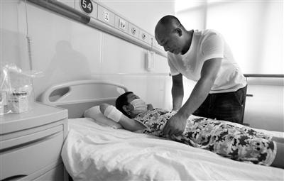 張明龍在醫(yī)院照顧孩子 記者 代澤均攝