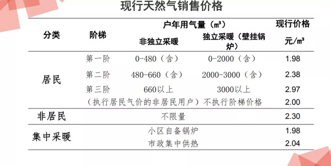 集中采暖用氣:居民小區(qū)自備鍋爐氣價為居民用氣一階氣價1.98元每立方米,市政集中供暖氣價為:2.04元每立方米。