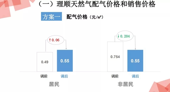 1、以“條件不具備的城市盡量縮小差價”為目標,以重新核定的配氣價格0.55元美立方米為基準,居民配氣價格由現(xiàn)行的0.49元每立方米調(diào)整為0.52元每立方米,上調(diào)0.03元每立方米,非居民配氣價格由現(xiàn)行的0.754元每立方米調(diào)整為0.704每立方米,,下調(diào)0.05元每立方米。