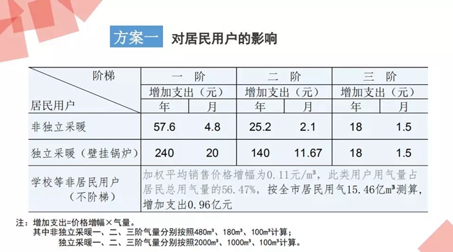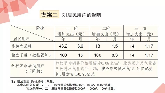 一是非獨立采暖用戶,按照調(diào)整后的居民用氣一階銷售價格,一階年最高氣量為480立方米計算,每戶年增加支出57.6元,月增加支出4.8元;二階最高氣量180立方米氣量計算,每戶年增加支出25.2元,月增加支出2.1元,對用氣量達到三階年最高氣量660立方米以上的用戶,氣價增幅0.18元每立方米,用氣100立方米,增加支出18元。