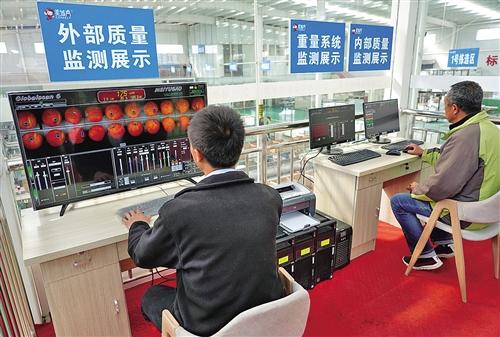 陜西洛川一蘋果企業(yè)車間內(nèi),工作人員通過智能選果控制系統(tǒng)監(jiān)測分選線上蘋果的外觀以及糖度、糖酸比。 新華社記者 邵 瑞攝